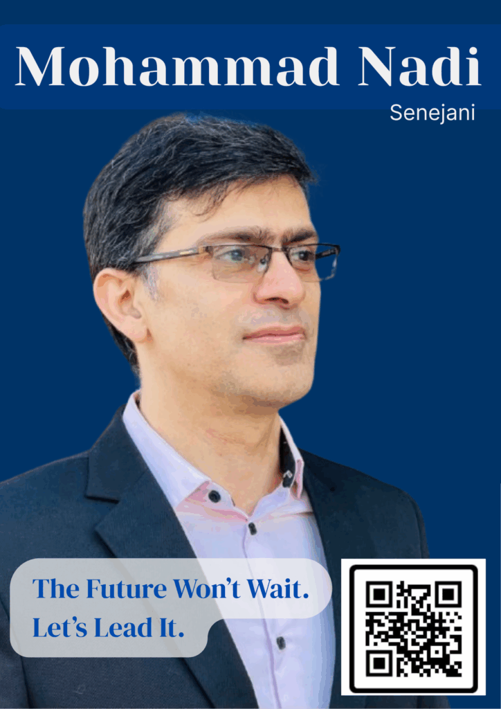 Bonjour — je suis Mohammad Nadi. Je crois que le gouvernement municipal doit être efficace, participatif et tourné vers l’avenir. Je souhaite intégrer une IA responsable dans les processus municipaux pour accélérer les permis, améliorer l’entretien et rendre l’information plus accessible à chaque résident.